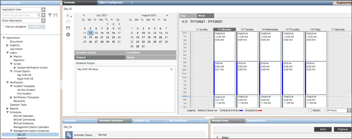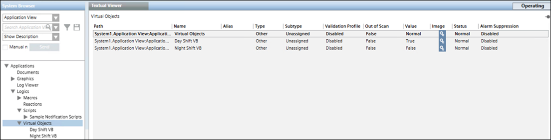 - Wählen Sie im System Browser Applikationen > Logik > Virtuelle Objekte und erstellen Sie dann virtuelle binäre Objekte namens Tagschicht VB und Nachtschicht VB. (Weitere Informationen erhalten Sie im Thema Virtuelle Objekte.)