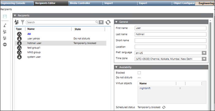 - Ziehen Sie in der Empfängergruppe Nacht_Schicht im Expander Verfügbarkeit das zuvor erstellte Objekte Nachtschicht VB in den Abschnitt Virtuelle Objekte.