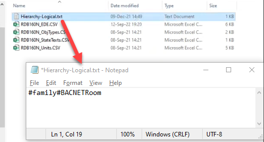 - Geben Sie in die Datei Hierarchy-Logical.txt die Zeile #family#BACNETRoom ein.