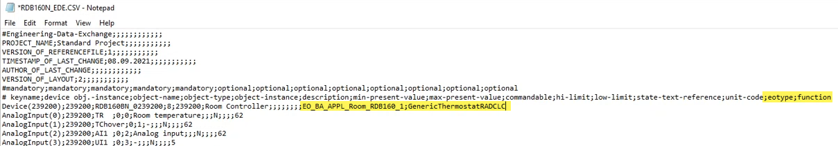 Hinweis: Diese Angaben müssen für jedes Gerät in der EDE-Datei hinzugefügt werden. Verschiedene Gerätetypen sind zulässig. - Importieren Sie die geänderte EDE-Datei in Desigo CC
