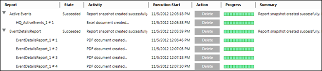 State | Displays the execution state of a Report, PDF, XLS. For example, Pending, Succeeded, Failed, and so on. |