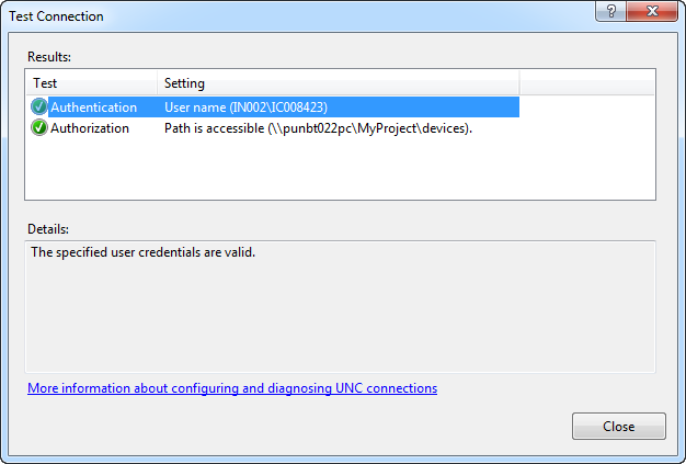 - In the Add Virtual Directory dialog box, click Test Settings to open the Test Connection dialog box.