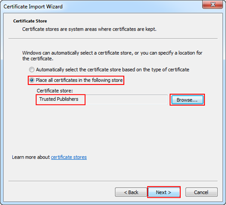 4. Select the Place all certificates in the following store option, and browse to and select Trusted Publisher Certificate store.