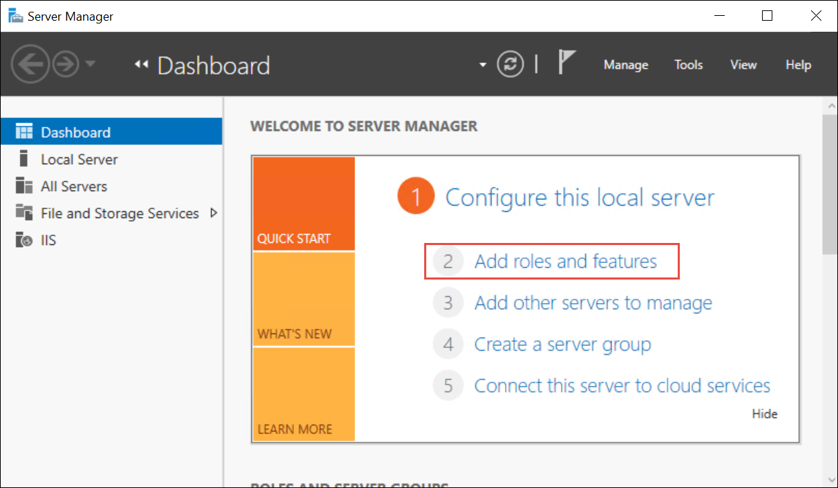 b. Klicken Sie im Windows Startmenü auf Server Manager. Wenn es dort nicht aufgeführt wird, geben Sie Server Manager im Feld Durchsuchen ein. - Klicken Sie im Menü Verwalten auf Rollen und Features hinzufügen.