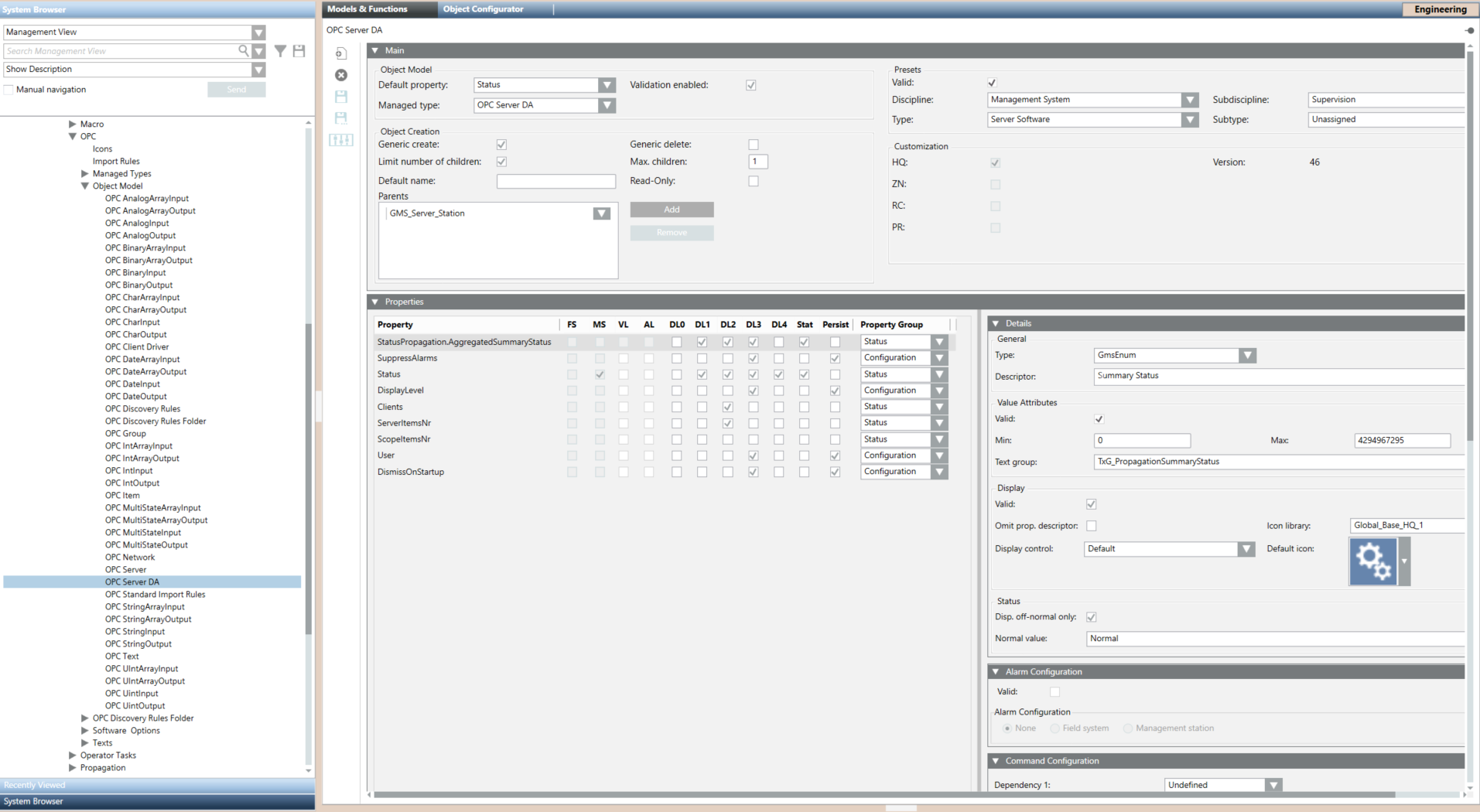 Die standardmässige OPC-Bibliothek, die die OPC-Datenmodelle unterstützt, finden Sie in der Managementsicht des System Browsers in folgendem Pfad: Projekt > Systemeinstellungen > L1-Headquarter > Global > OPC.