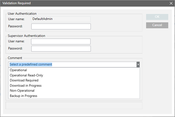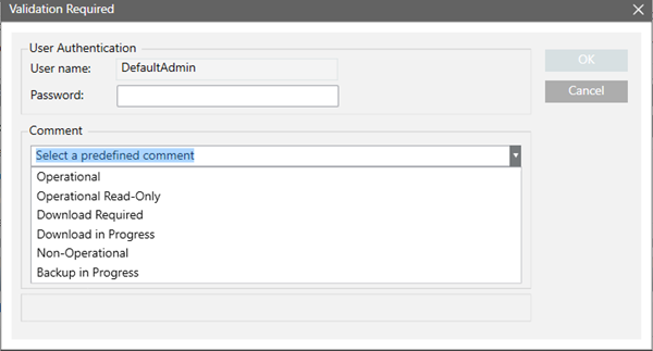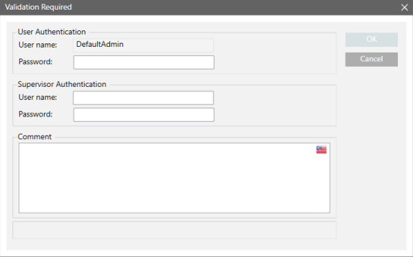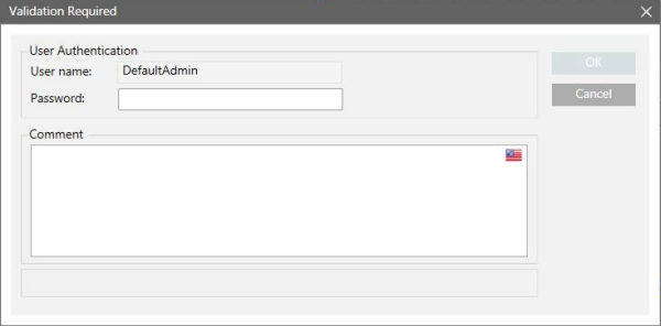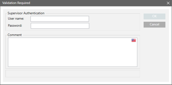 Dieser und der nächste Abschnitt zeigen zwei Dialogfelder für jedes Validierungsprofil. Das erste Dialogfeld erfordert einen vom Benutzer eingegebenen Kommentar. Das zweite Dialogfeld erfordert die Wahl eines Kommentars aus einer vordefinierten Liste. Welches Dialogfeld angezeigt wird, wenn Sie ein validiertes Objekt ändern oder darauf zugreifen, hängt davon ab, ob für das jeweilige Objekt vordefinierte Kommentare konfiguriert sind. Wenn keine vordefinierten Kommentare konfiguriert wurden, wird das erste Dialogfeld angezeigt. Wenn vordefinierte Kommentare konfiguriert wurden, wird ein dem zweiten Beispiel ähnliches Dialogfeld angezeigt.