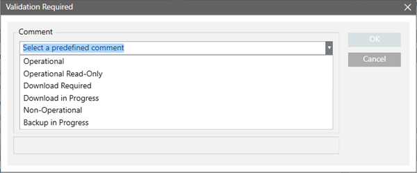 Wenn Sie ein validiertes Objekt in der Managementstation ändern oder befehlen, wird möglicherweise das Dialogfeld Validierung erforderlich angezeigt. Dies hängt von verschiedenen Faktoren ab, z.B. dem konfigurierten Validierungsprofil, der Konfiguration eines Vier-Augen-Prinzips oder die Anforderung eines Kommentars. Weitere Informationen finden Sie in der folgenden Tabelle.