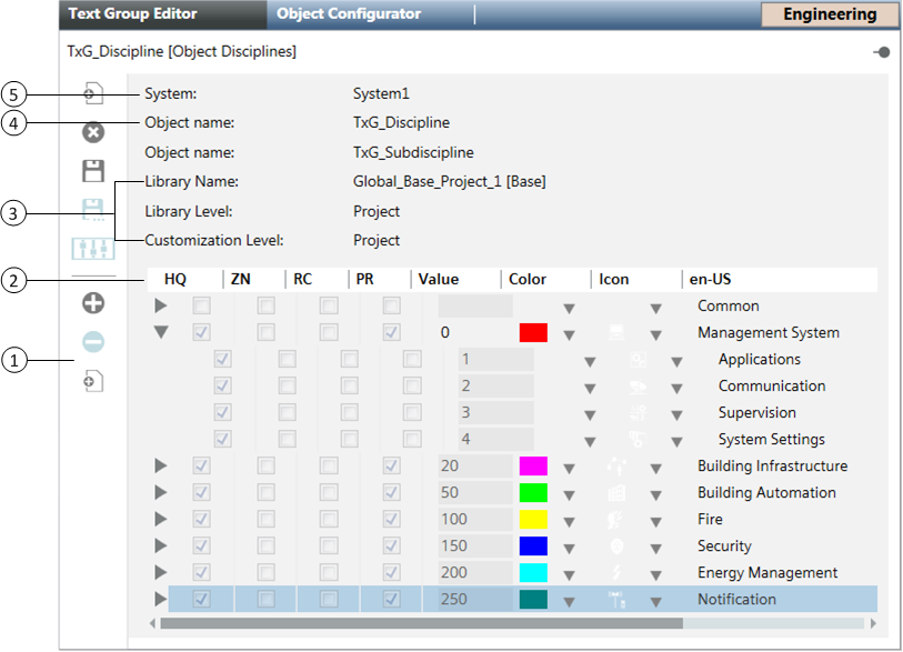 Der Textgruppen-Editor unterstützt zudem verschachtelte Textgruppen, sodass Sie Disziplinen und ihre Subdisziplinen anzeigen können. Im folgenden Beispiel einer Textliste ist die Disziplin Gebäudeautomation ausgewählt und erweitert, um die drei zugehörigen Subdisziplinen zu zeigen.