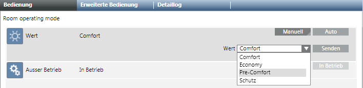 - Die Raumgrafik wird geöffnet und die wichtigsten Werte werden im Register Bedienung angezeigt.