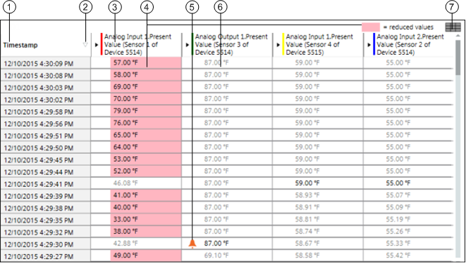 Die Tabellenansicht bietet eine andere Sicht als die Standardansicht, wo Kurven als Serien dargestellt werden. Jede Serie wird als Spalte im Datenraster angezeigt. Die erste Spalte (rechts) enthält den Zeitstempel.