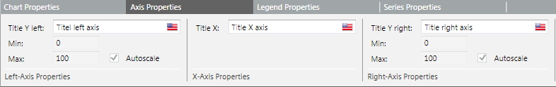 Jedes Diagramm kann eine rechte und eine linke Y-Achse, die unabhängig voneinander sind, anzeigen. Serien können selektiv zugewiesen und auf jede der Achsen skaliert werden, sei es per Vorgabe oder manuell. Skalierung ist standardmässig auf automatisch eingestellt.