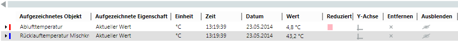 Die Tabellenansicht zeigt nur Werte ab dem grafischen Zeitbereich an. Diese Werte werden beim Datenexport exportiert.