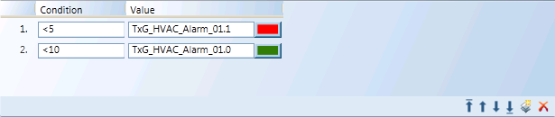 Wenn Sie beispielsweise die Textgruppe HVAC_Alarm_01 im Textgruppeneditor öffnen, können Sie sehen, dass für diese zwei Zustände, Normal und Alarm definiert sind. Jedem Zustand ist ein Wert sowie eine Farbe und ein Symbol zugewiesen.