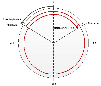 Die folgende Zeichnung zeigt, wie die Werte der Eigenschaften Minimum und Maximum des Rotator-Befehls zusammen mit dem Start- und Drehwinkel bei einer Gesamtsumme von weniger als 360 Grad, also weniger als einer gesamten Drehung, platziert werden.