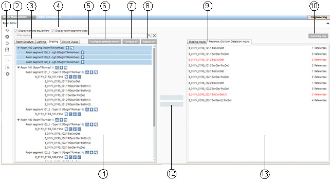 13 | Zuweisungsliste Je nach gewählter Steuerungsart in der Rauminformationsliste werden die jeweiligen Detailinformationen zu HLK, Beleuchtung oder Beschattung angezeigt. Mittels Doppelklick werden die jeweiligen Referenzen in der Rauminformationsliste angezeigt. | ||