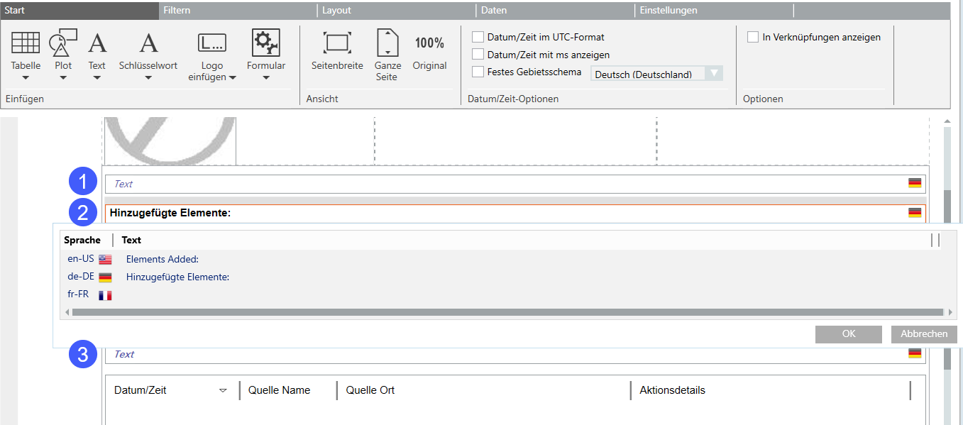 - Geben Sie einen lokalisierten Text (1, 2 und 3) für den Standardbericht ein.