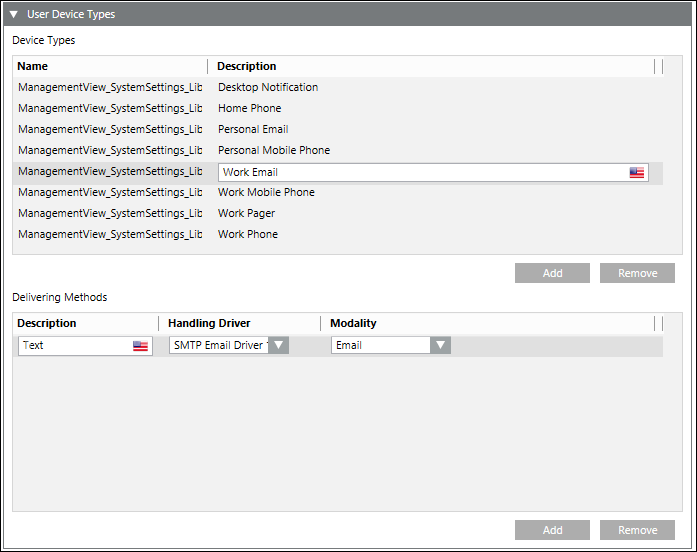 Der Benutzergerätetyp ist konfiguriert. Auf dem Register Empfänger-Editor können Sie unter dem Expander Benutzergerätetypen sehen, dass der SMTP-E-Mail-Treiber als Handling-Treiber und die Modalität als E-Mail festgelegt sind.