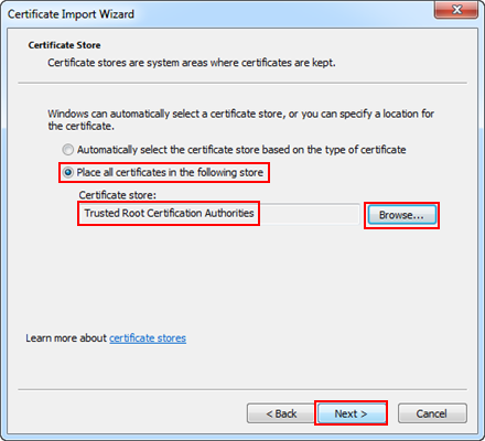 Sie möchten die Zertifikate über das Dialogfeld Zertifikat im Windows-Zertifikatspeicher der vertrauenswürdigen Stammzertifizierungsstellen installieren.