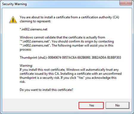 Wenn die Sicherheitswarnung angezeigt wird, klicken Sie Ja, um das Zertifikat zu installieren.