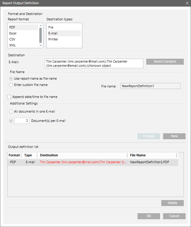 Die neue Email-Adresse wird in die Ausgabe-Definitionsliste im Dialogfeld Berichtausgabedefinition und in die Kontaktliste im Dialogfeld Email-Kontakte integriert.