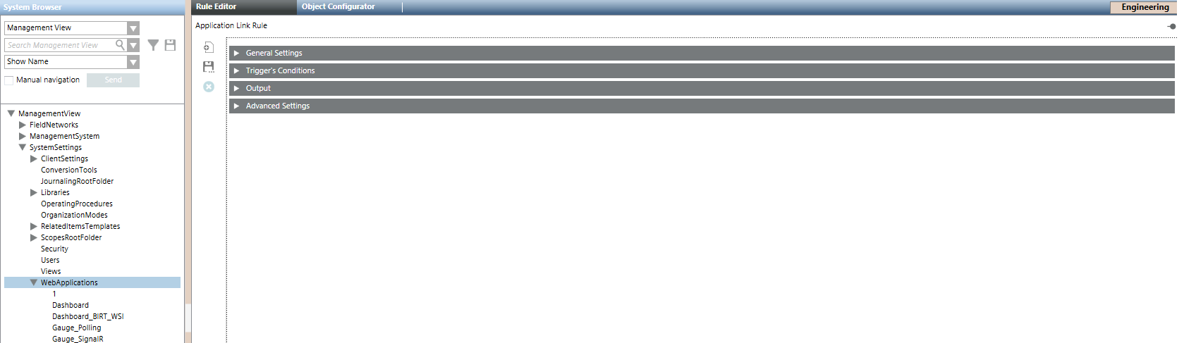 Rule Editor WorkspaceThe Rule Editor workspace consists of the Rule Editor pane and the Rule Editor toolbar. General SettingsTrigger ConditionsOutputAdvanced SettingsRule Editor Toolbar