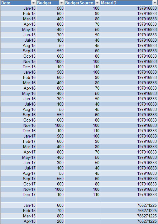 BudgetSource | Consumption budget planned for the month and year. This is for the source meter. This is applicable only if the managed meter has a source meter. |