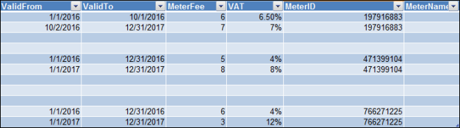 ValidFrom | Start Date from when the VAT and meter fee is applicable. | The ValidTo must always be greater than Valid From. For example, if the VAT is applicable from 1st January, 2016 to 31st December, 2016, then the ValidFrom value will be 1st January, 2016 and the ValidTo value will be 31st December, 2016 If there is a change in the VAT and meter fee from 1st January, 2017, you will have to add a new row for the same managed meter with the above information. |