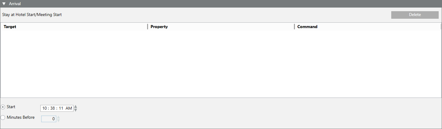- The Room Automation tab is displayed. Each condition occupies one row, and is comprised of a set of fields (such as Target, Property, Command, and so forth) defining a command that will be issued when the condition is satisfied for a guest’s arrival and departure.