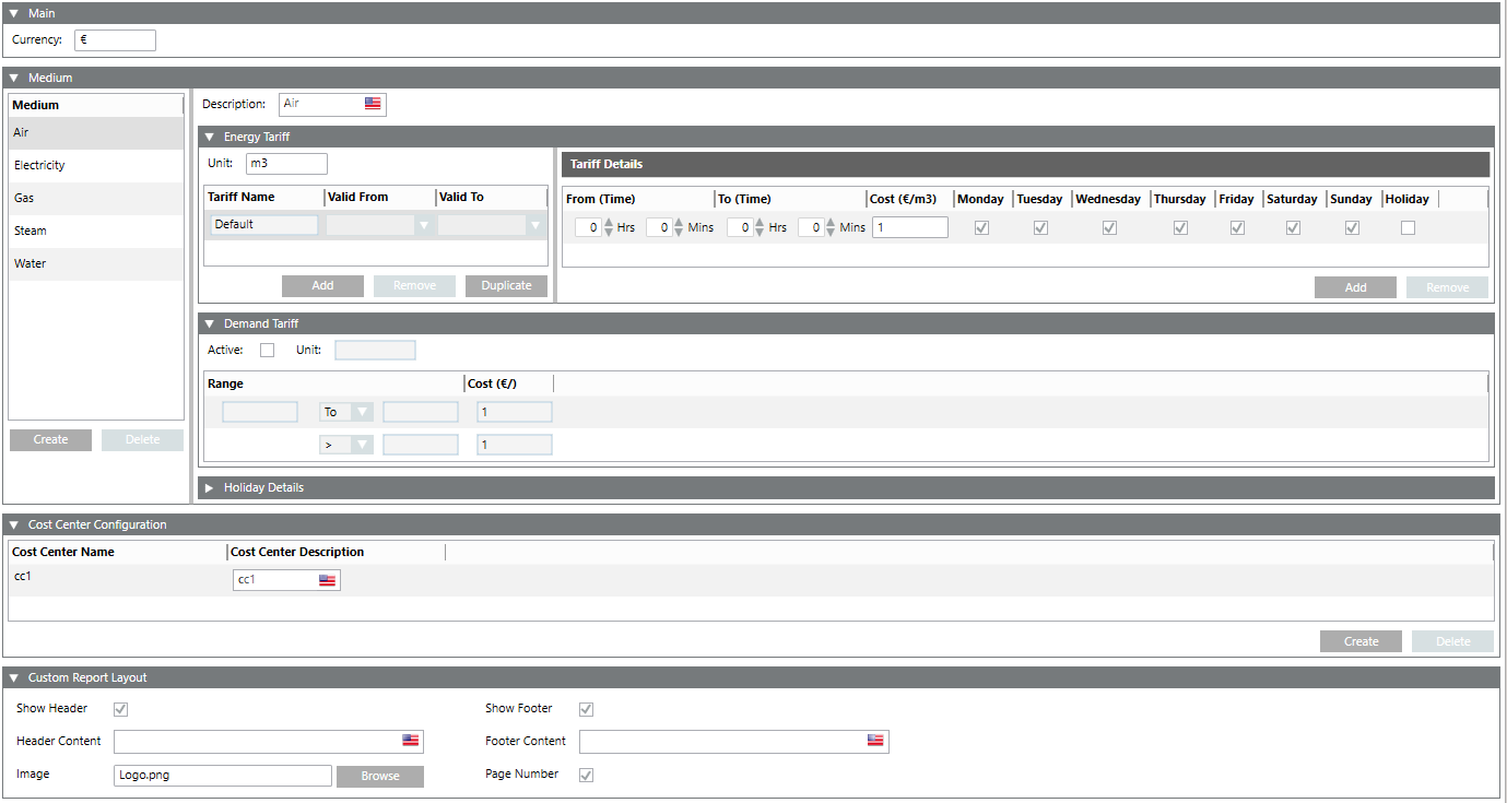 This expander is applicable only to the Cost Center report. It allows you to create a medium representing an energy source and define the energy and demand tariff details with the holiday details. It comprises of the following expanders: