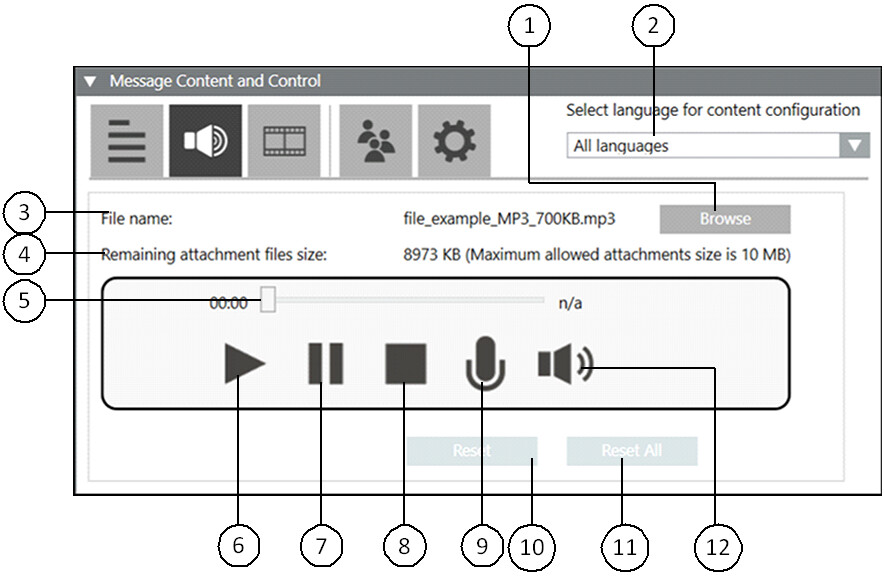 • Reset: Resets only the multimedia file configured for the currently selected language.