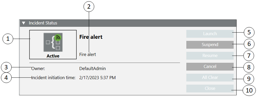 The Incident Status expander displays the current incident state, incident details (such as incident type, owner), initiation time, and buttons to perform suspend, resume, cancel, all clear, and close operations on incidents.