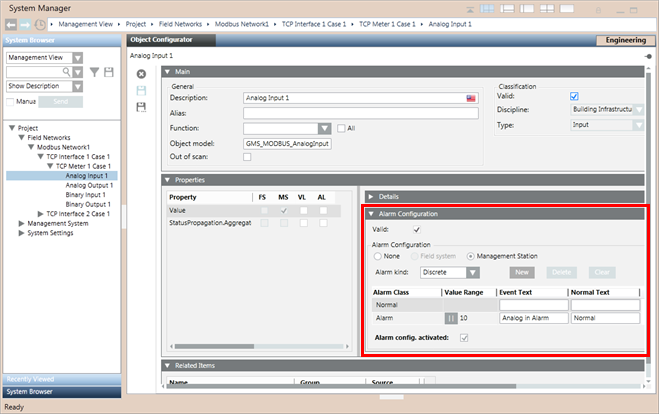 - The alarm details display in the Alarm Configuration expander in the Object Configurator tab.
