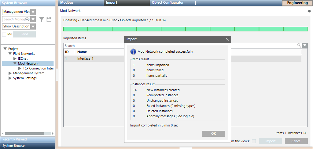 17. When the import completes successfully, the Import dialog box displays a summary of the import information.