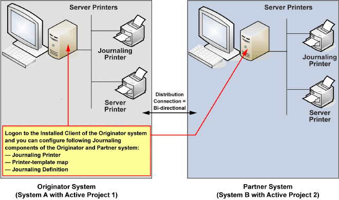 In einem verteilten Systemumfeld mit zwei Desigo CC-Systemen muss die Protokollkonfiguration dennoch vollständig lokal auf einem der zwei Systeme liegen. Das bedeutet, dass alle Parameter, zum Beispiel Protokolldrucker, Vorlage, Definition und Filter (Alarme, Aktionen, Werte und Zustände), auf denselben Desigo CC-Server verweisen müssen.