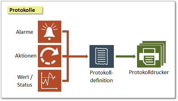 Protokollausdrucke können mit Protokollfiltern so konfiguriert werden, dass sie spezifische Alarmtypen, Wert-/Statusänderungen, Bedieneraktivitäten wie das Absetzen von Befehlen oder Systemfehler beinhalten.