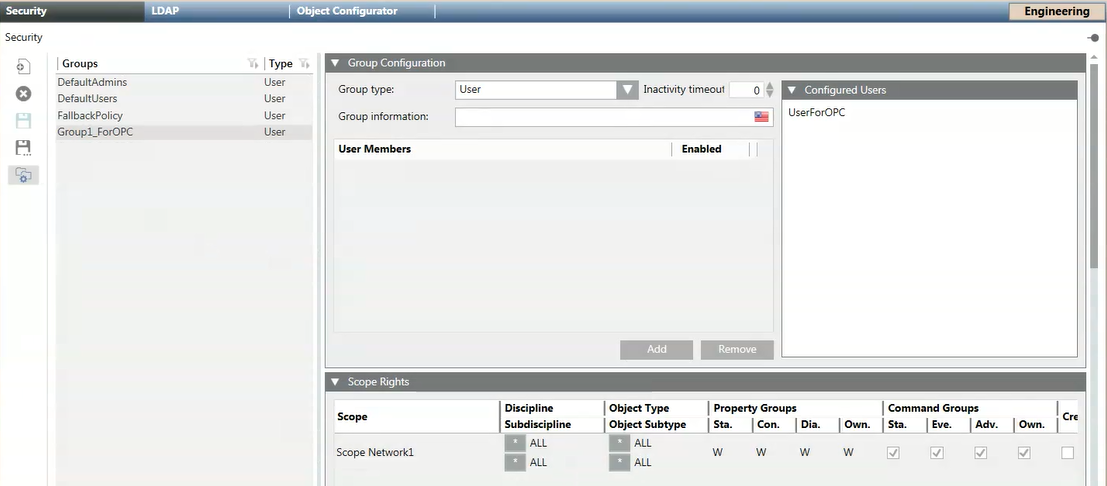 Die Scopes, die Sie durch den Desigo CC OPC-DA-Server verfügbar machen möchten, müssen mit der OPC-Benutzergruppe verknüpft werden, und die Anwendungsrechte der Gruppe müssen entsprechend konfiguriert werden. Hintergrundinformationen hierzu finden Sie unter OPC-Sicherheitseinstellungen.