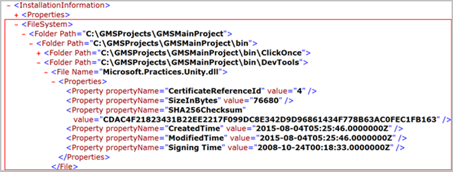 - Liefert den Prüfsummenbericht für die Dateien (Dateitypen: .drv, .com, .dll, .exe, .ctc, .lst, .ctl) in den Ordnern des aktiven Projekts, den Ordnern GMSMainProject und WinCC-OA. Die Daten werden unter den entsprechenden Ordnern im Abschnitt Dateisystem der XML-Datei angezeigt. Wenn für eine bestimmte Eigenschaft kein Wert abgerufen wird, wird die Eigenschaft selbst auch nicht angezeigt. Wenn zum Beispiel kein Wert für den Zeitpunkt der Signierung einer Datei vorhanden ist, wird die Eigenschaft für die Signierung nicht wiedergegeben.