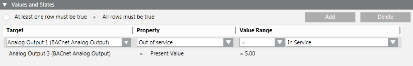 - Sie können angeben, ob alle Bedingungen (UND-Operand zwischen Zeilen) oder nur eine (ODER-Operand zwischen Zeilen) wahr sein muss/müssen, um den Trigger für Werte und Zustände auszulösen.
