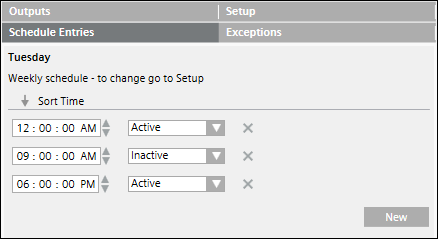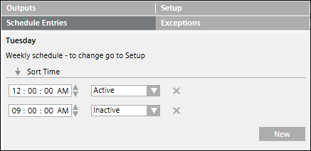 Sie erstellen einen wöchentlichen Zeitplan aus der Dropdown-Liste Subtyp des Registers Konfiguration. Der letzte Zustand des Tages wird nach 24:00 Uhr erst beibehalten, wenn der Eintrag des Tageszeitplans für den Folgetag ausgelöst wird.