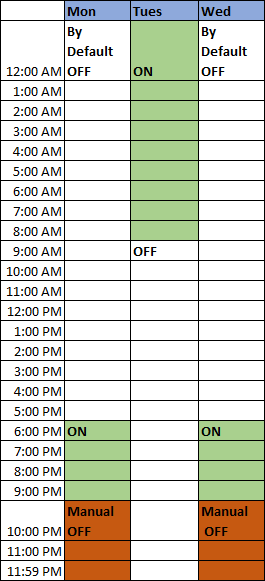 Wenn Sie in diesem Fall den Zustand des Datenpunktes am Montag um 22:00 Uhr manuell auf AUS stellen, bleibt der Zeitplan bis 23.59 Uhr AUS und wird am Dienstag um 12:00 Uhr wieder auf Aktiv (EIN) geschaltet.