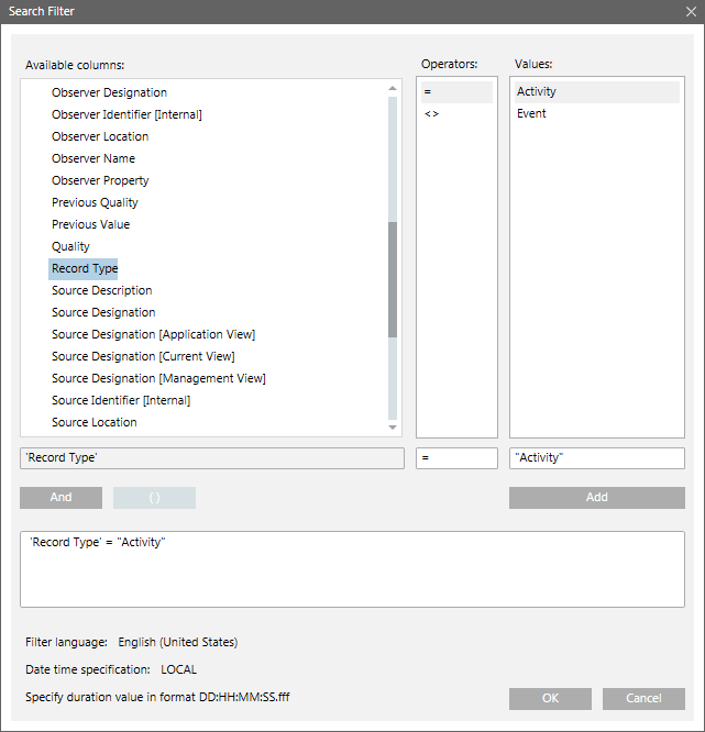 Das Dialogfeld Suchfilter ermöglicht es, eine Suchfilterbedingung anzuzeigen und eine Filterbedingung für die Spalten festzulegen, die in der Log-Ansicht nicht dargestellt sind.