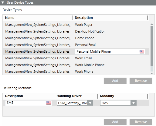 Der Benutzergerätetyp ist konfiguriert. Auf dem Register Empfänger-Editor können Sie unter dem Expander Benutzergerätetypen sehen, dass der GSM-Gateway-Treiber als Handling-Treiber und die Modalität als SMS festgelegt sind.