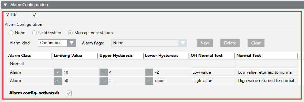 LowerHysteresis | Optional | Gibt den Operanden und den unteren Hysteresewert für diesen Alarmzustand an. Bei einer normalen Bedingung werden diese Daten ignoriert. Einzelheiten zur Konfiguration finden Sie unten in Fortlaufende Alarme - UpperHysteresis und LowerHysteresis. |