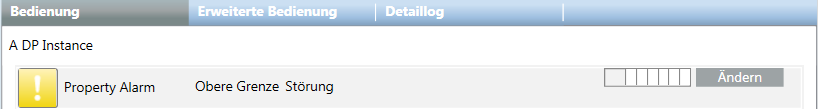 - Der Alarm wird ausgelöst und in der Übersichtsleiste unter der Alarmkategorie Zustand angezeigt. In der Spalte Ursache werden der definierte Alarmtext Störung ein und in Klammern die beiden definierten Zustände (Obergrenze Störung) angezeigt.