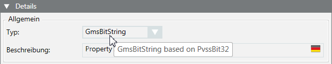 - Überprüfen Sie in Expander Details und im Gruppenfeld Allgemein den Typ. Im Tooltip muss der Datentyp GmsBitString basierend auf PvssBit32 angezeigt werden.