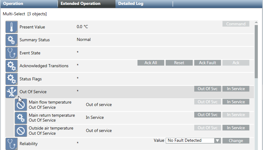 1. The objects must be of the same type, such as analog input. If different object types are selected, the message No properties (different properties) displays in the Operation tab.