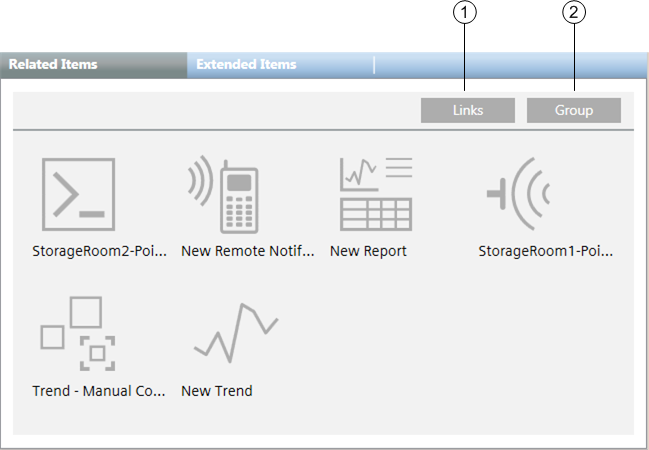 If text links are displayed, clicking the Group button displays text links by categories such as analog inputs, analog outputs, schedules, reports, PDFs, Word files, and Web links.