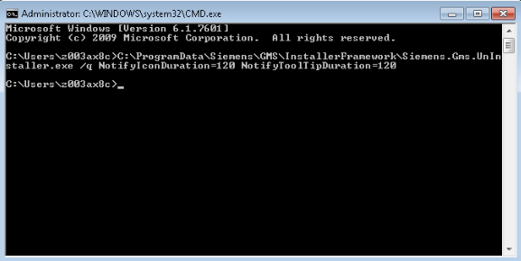 <Full path of the file Gms.UnInstallerSetup.exe> /q <NotifyIconDuration = Time in seconds> <NotifyToolTipDuration = Time in seconds>