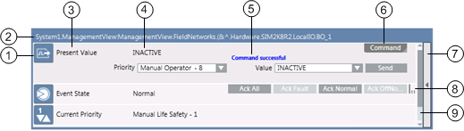 Displays the name of a command that you can initiate. If a command button has a triangle in the lower right-hand corner, the command has multiple buttons or options, and clicking on the triangle displays the options. Some commands are sent immediately after you initiate them by clicking on the Command button. Others require you to enter arguments before they can be sent. When a command requires arguments (additional fields requiring information to continue with the command), the property row will expand after you click the command button. You then complete the additional fields and click the appropriate button (Send, Command, etc.).
