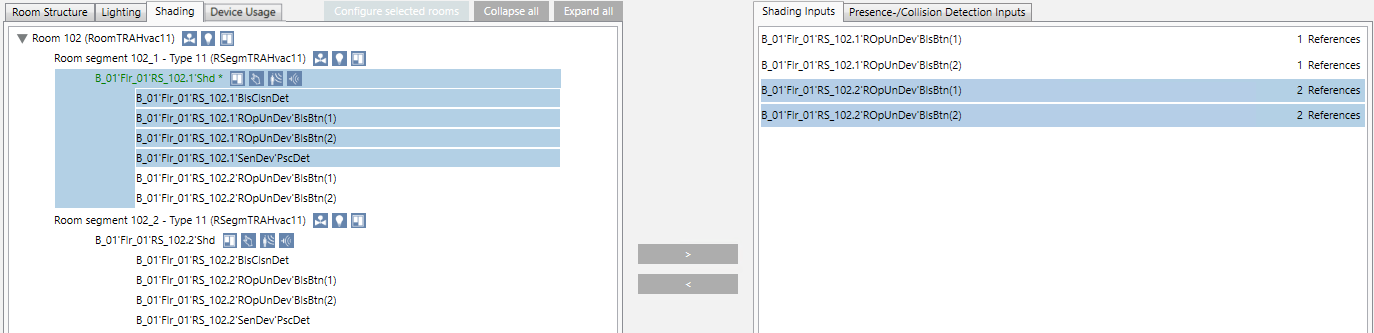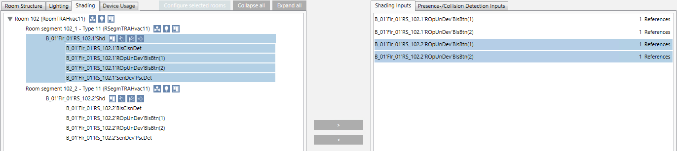 7. Highlight the shading inputs RS_102.2‘ROpUnDev‘BlsBtn(1) and RS_102.2‘ROpUnDev‘BlsBtn(2). Note that you must perform the assignment in both directions (from segment 1 to segment 2 and from segment 2 to segment 1).
